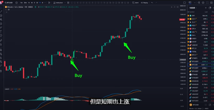 如果价格跌破60K,第一根红柱的出现可能是一个买点。举例来说,回顾2023年6月的情况,价格大约在26K,而LMACD出现死亡交叉的第一根红柱是一个不错的买点。虽然后面价格有所下跌,但短期内依然上涨。同样,观察2024年1月的情况,第一根红柱出现在这个时候,尽管前面有低点,但同样也是一个不错的买点。再回顾2020年9月,价格出现下跌,但未跌破前低点,此时LMACD的第一根红柱也是一个买点。