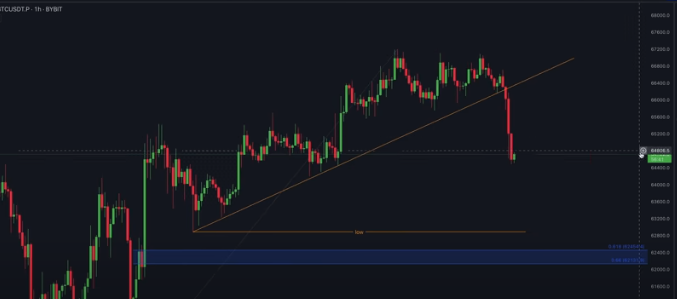 目前来看价格的确出现了下跌,符合我们的交易计划。但是我们优先考虑在价格下跌到更低的位置时进行做多。如果价格下跌了,但我们没有做空,那完全是按照我们的计划执行的,我认为这没有什么问题。我们来看一下小级别图表上的走势。从小时图来看,为什么会出现下跌呢?因为出现了一条趋势线的突破。早盘时,我发现有一些盘口的背离,很多人选择在这里做空。但是为什么要做空呢?我发现是因为趋势线的突破。你可以看到这条趋势线被突破了,然后现在价格跌到这个位置。但我个人按照昨天的观点,并没有选择在这里做空,而是选择耐心等待,等待价格跌到更低的位置。