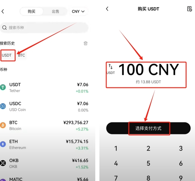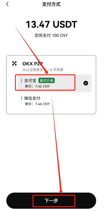 选择想要购买的加密货币种类(如USDT)和购买金额后,系统会显示大约能购买的币量。确认无误后点击“下一步”,选择支付方式(如支付宝)。