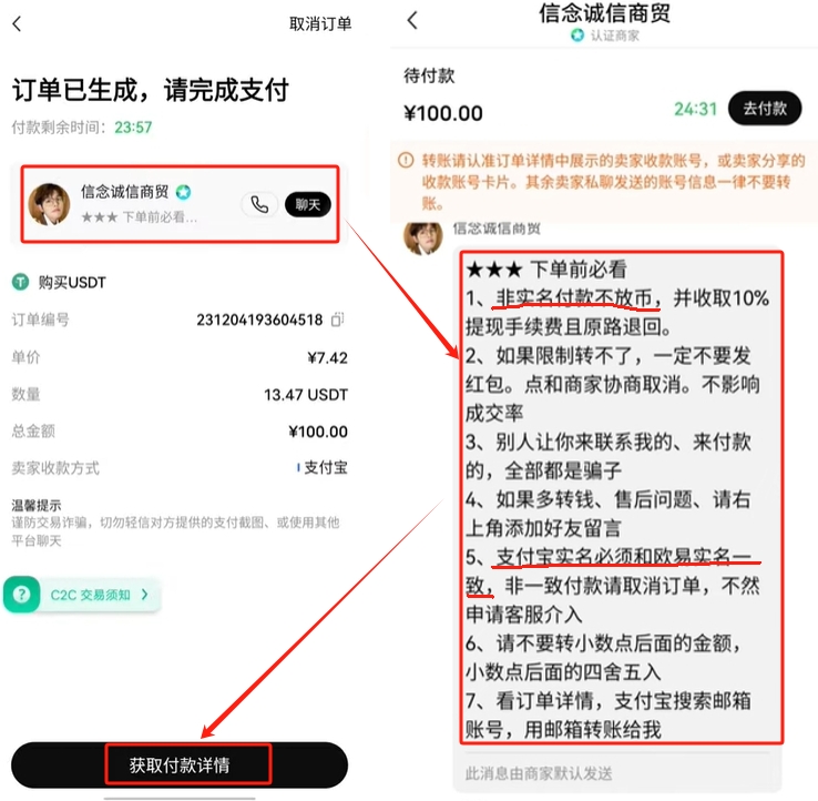 生成订单后可以在聊天框内与卖家沟通交易细节,并确保付款前了解卖家的要求。完成转账后,务必返回平台页面并点击“我已支付”告知平台和卖家,以便他们及时确认收款并释放币种到您的账户中。