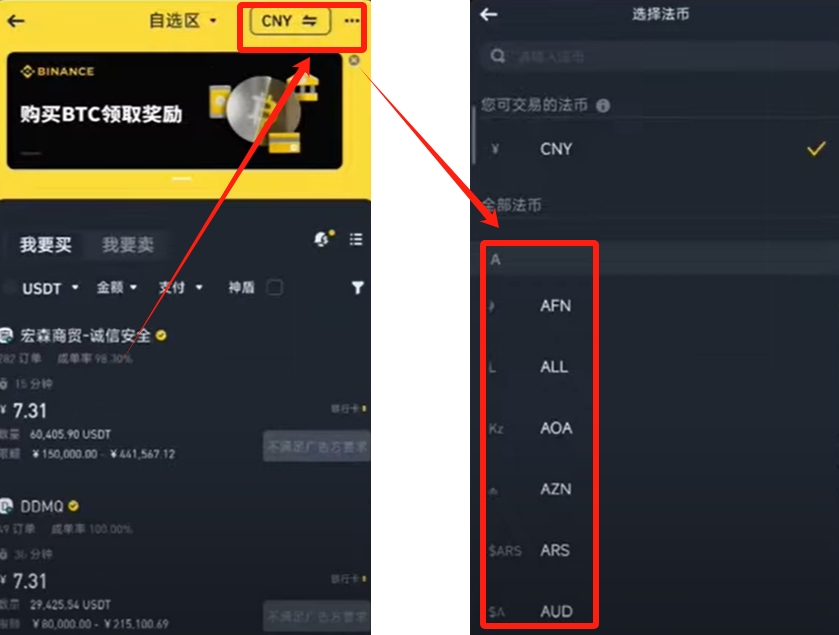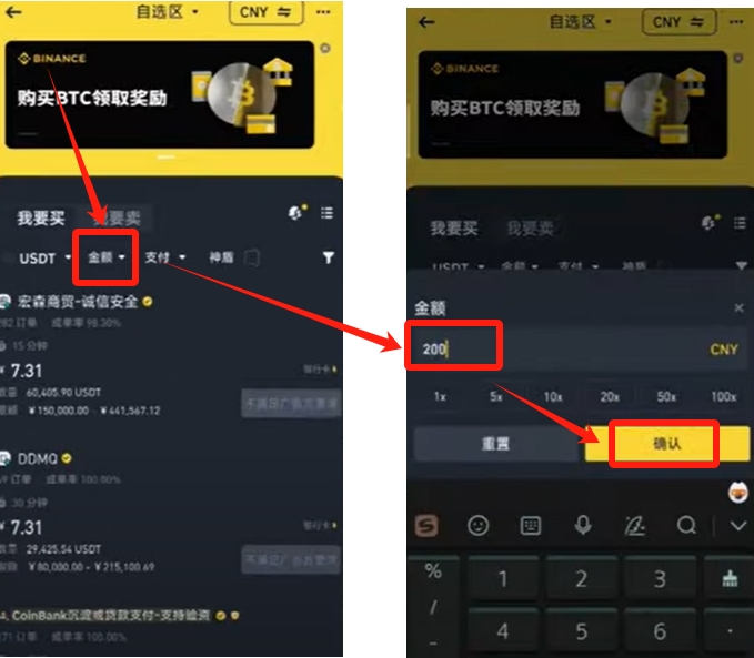 接下来选择你要用的法币。在页面的右上角,你可以选择“CNY”(人民币)或其他你需要的法币。然后,在下方页面输入你想要购买的金额,例如200元,并点击【确认】。系统会自动筛选出符合条件的商家供你选择。