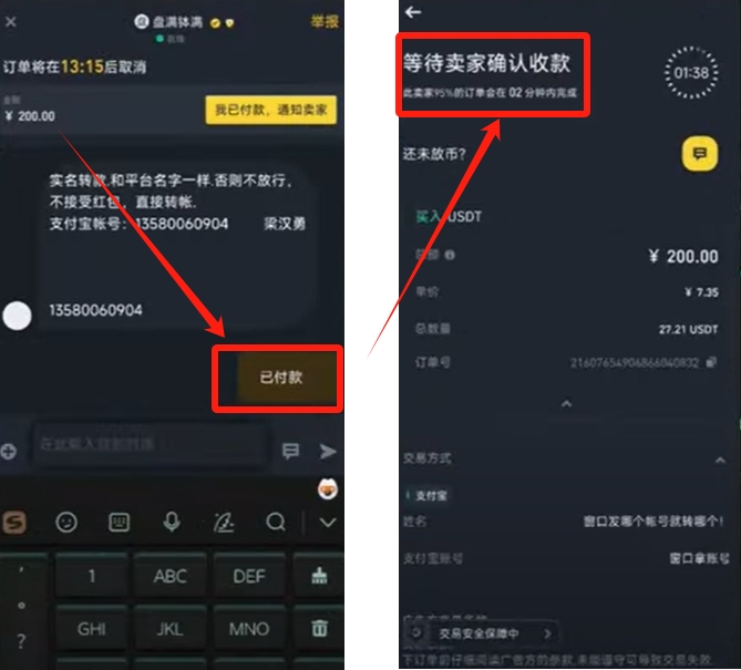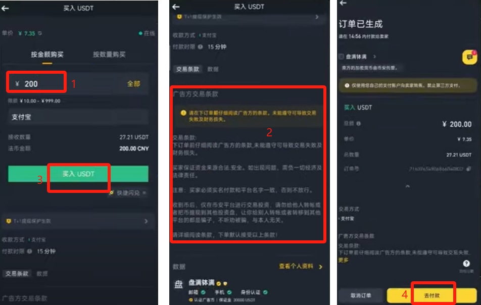 点击【买入】后,输入购买金额并查看广告方的要求。特别注意实名信息在币安和支付宝上是否一致,这是确保交易安全的重要步骤。然后点击【买入USDT】,再点击【去付款】。